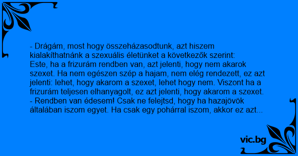 - Rendben van édesem! Csak ne felejtsd, hogy ha hazajövök általában iszom egyet. Ha csak egy pohárral iszom, akkor ez azt jelenti, hogy nem akarom a szexet. Ha két pohárral iszom, akkor ez azt jelenti: akarom a szexet, de lehet, hogy nem. Viszont ha több mint két pohárral iszom, akkor kurvára nem fog érdekelni, hogy milyen a hajad!
