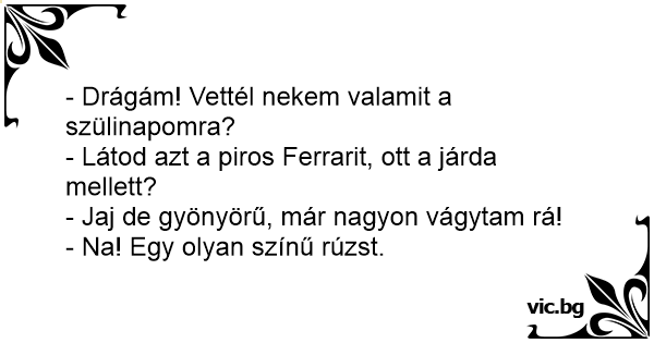 En tjej fyller år .. Hennes kille ringde och sa : Kolla från fönstret. Tjejen kollar .. Killen : ser du den mörk röda bilen ? Tjejen : Ja (förvånad) Killen : Jag köpte en nagellack med samma färg XD