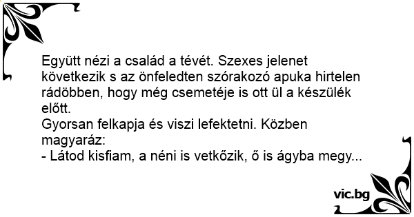 Együtt nézi a család a tévét. Szexes jelenet következik s az önfeledten szórakozó apuka hirtelen rádöbben, hogy még csemetéje is ott ül a készülék előtt.
