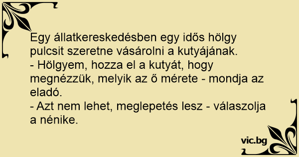 - Hölgyem, hozza el a kutyát, hogy megnézzük, melyik az ő mérete - mondja az eladó.