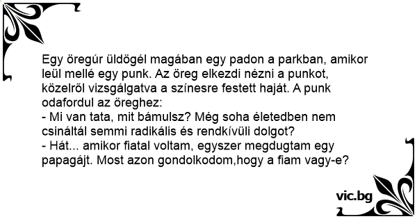 Старецот и панкерот Το παγώνι και ο πανκ... Един стар моряк гледа един пънкар, с разноцветно боядисан гребен. In der U-bahn sitzt ein alter Mann einem Punker gegenüber, der einen richtig schönen Irokesenschnitt hat. Nach einer Weile fragt der Punker den immer noch guckenden alten Mann: A young punk gets on the cross-town bus. A punk rocker gets on the bus with green, yellow, purple and orange hair. An old guy sitting on the bus stares at him, and the punk says: A guy with bright blue, green and orange color hair was standing at a bus stop. Few moments later an elderly man stood near him and kept staring at him hard. Annoyed by the stares the guy asked him, "Wotz up oldie! Never done something wild?" To this the old man replied, "Yeah,I f*cked a... Um velho entra no ônibus e senta na frente de um punk com mechas verdes, vermelhas, azuis, amarelas. Ele fica olhando para o punk por muito tempo. O punk já irritado pergunta para o velho: — O que foi vovô? Nunca fez nada de diferente quando era jovem? — Fiz sim! Uma vez eu transei com uma arara.... One day, an old guy gets on a bus. Several minutes later a punk kid with red, green, and orange hair gets on. The kid notices that the old man keeps staring at him. "What you staring at, old man? Ain't you ever done anything wild in your time?" "Yeah. I screwed a parrot once. I was wondering if... A Londres, un banquier de la city, très élégant avec chapeau melon, parapluie canne et costume noir rencontre un punk avec les cheveux rouges et verts à un arrêt de bus. Le vieux banquier regarde... Der Bauer kommt in die Stadt und sitzt neben einem Punk im Bus. Der Alte schaut den Punk mit der roten Kammfrisur die ganze Zeit an. Da raunzt der Punk: „Was guckste denn so doof, alter Sack?“ Der... Va un viejito por la calle y se tropieza con un muchacho de éstos todo Punk con los pelos parados y pintados de todos colores y vistiendo ropa escandalosa y estrafalaria. El señor se le queda... Bij een bushalte staan een oude en een jonge man. De jonge heeft een uitbundige rood-blauw-groene hanenkam en in neus en oren hangen de nodige ringen met kettingen van allerlei soort. De oude man... Um senhor de idade senta num banco no ônibus .... bem de frente com um punk de cabelos espetados, compridos, com mechas verdes, azuis, rosa e vermelhas. O senhor fica olhando fixamente sem... A una stazione un vecchio fissa un punk tutto con i capelli colorati e il punk dice: "nonno nella tua vita di merda non hai mai trasgredito?" il vecchio risponde: "si, da giovane mi sono inculato... En äldre man sitter på en parkbänk i staden när en ung man med spikrakt uppåtstående hår kommer och sätter sig bredvid. Killens hår är gult och grönt med orange och lila strimmor och ögonen är... Egy öregember üldögél egy padon. Odaül mellé egy punk csávó a szivárvány színeiben játszó tarajos hajával. Az öreg csak bámul rá. Végül a punk nem bírja tovább és megkérdezi: - Mi van tata, még... Gammel mand En gammel mand er ude og køre i tog. Foran ham i kupeén, sidder en punker med håret formet som en hanekam. Den gamle mand stirrer på ham med store øjne i meget lang tid. Det bliver til... En äldre man sitter på tåget. Efter en stund kliver det på en punkare med en stor, röd tuppkam och sätter sig mitt emot mannen. Mannen stirrar länge och intensivt på punkaren, och till slut får han... Un vieil homme est dans un restaurant. Sur la table d'à côté, il apercoit un punk avec une crète rouge. Il le regarde alors pendant un bon moment. Le punk, agacé par cela, se lève alors et se... Gjort noget helt vildt En gammel mand står på toget og sætter sig i en kupe, hvor der sidder en punker med hanekam og alt, hvad der nu hører sig til en punker. Den gamle mand og punkeren sidder... På en station steg en gammel mand på toget og satte sig ind i en kupé. Her kom han til at sidde overfor en punker med hanekam, øreringe og hele Pivtøjet. De sidder og kigger lidt på hinanden, og... Akropolyje ant suoliuko sėdi senukas. Netrukus ant to pačio suoliuko prisėda pankas su įspūdingai žalia - geltona - mėlyna - raudona skiautere. Senukas pažiūrėjo į panką, po to dar kartą...