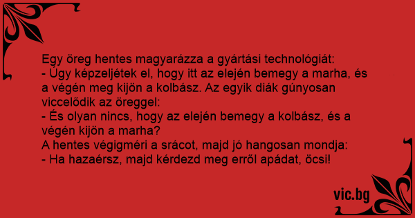 - Úgy képzeljétek el, hogy itt az elején bemegy a marha, és a végén meg kijön a kolbász. Az egyik diák gúnyosan viccelődik az öreggel:
