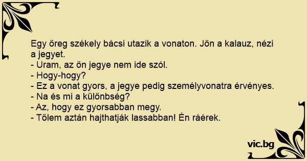 Egy öreg székely bácsi utazik a vonaton. Jön a kalauz, nézi a jegyet.