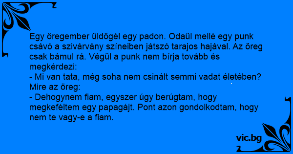 Egy öregúr üldögél magában egy padon a parkban, amikor leül mellé egy punk. Az öreg elkezdi nézni a punkot, közelről vizsgálgatva a színesre festett haját. A punk odafordul az öreghez: - Mi van...