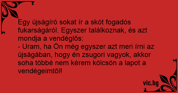 Egy újságíró sokat ír a skót fogadós fukarságáról. Egyszer találkoznak, és azt mondja a vendéglős: