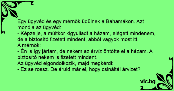 Egy ügyvéd és egy mérnök üdülnek a Bahamákon. Azt mondja az ügyvéd: