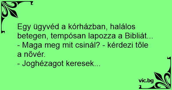 Egy ügyvéd haldoklik a kórházban, és amikor egy barátja meglátogatja, éppen a Bibliát lapozgatja kétségbeesetten. - Hát te meg mi a francot csinálsz? - kérdezi a barát. Mire az ügyvéd: - Joghézagok...