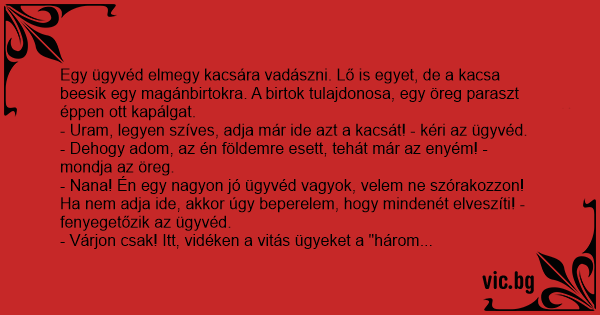 Egy ügyvéd elmegy kacsára vadászni. Lő is egyet, de a kacsa beesik egy magánbirtokra. A birtok tulajdonosa, egy öreg paraszt éppen ott kapálgat.