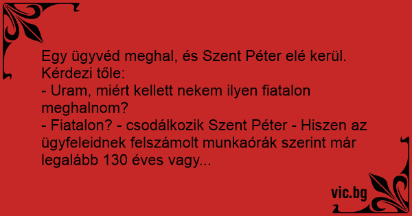 - Fiatalon? - csodálkozik Szent Péter - Hiszen az ügyfeleidnek felszámolt munkaórák szerint már legalább 130 éves vagy...