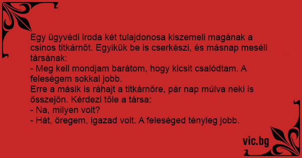 Erre a másik is ráhajt a titkárnőre, pár nap múlva neki is összejön. Kérdezi tőle a társa: