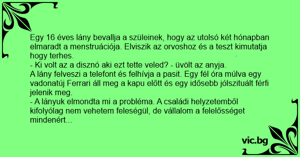 Девојката и се пожалила на мајката дека е трудна. Мајката почнала да вришти и да крева паника, да му каже на татко и, дека сака да знае која е свињата која го направила тоа и слично. Девојката кога останала сама направила еден телефонски разговор и после пола саат дошол млад убав и сериозен...