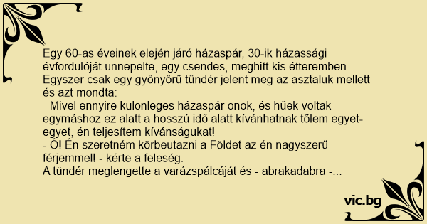 - Nos, ez az egész nagyon romantikus, de egy ilyen alkalom csak egyszer adatik meg az életben, szóval ne haragudj kedvesem, de az én kívánságom egy nálam 30 évvel fiatalabb feleség!