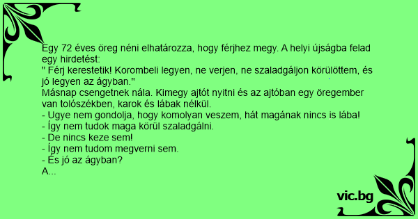 " Férj kerestetik! Korombeli legyen, ne verjen, ne szaladgáljon körülöttem, és jó legyen az ágyban."