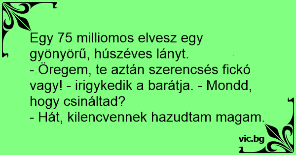 - Öregem, te aztán szerencsés fickó vagy! - irigykedik a barátja. - Mondd, hogy csináltad?