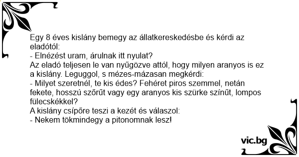 Egy 8 éves kislány bemegy az állatkereskedésbe és kérdi az eladótól: