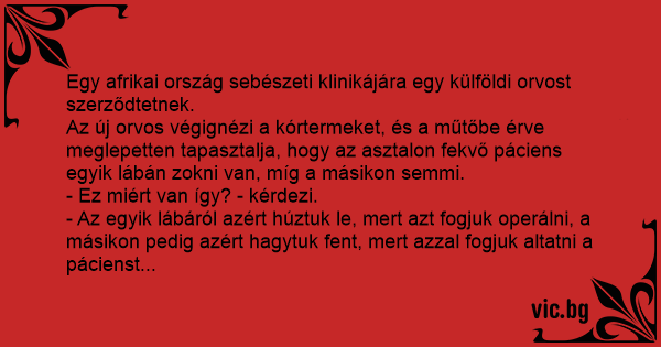 Az új orvos végignézi a kórtermeket, és a műtőbe érve meglepetten tapasztalja, hogy az asztalon fekvő páciens egyik lábán zokni van, míg a másikon semmi.