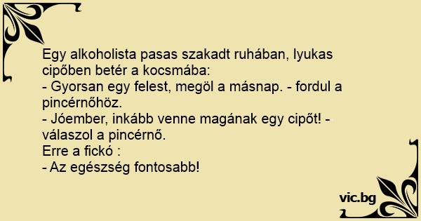 Egy alkoholista pasas szakadt ruhában, lyukas cipőben betér a kocsmába: