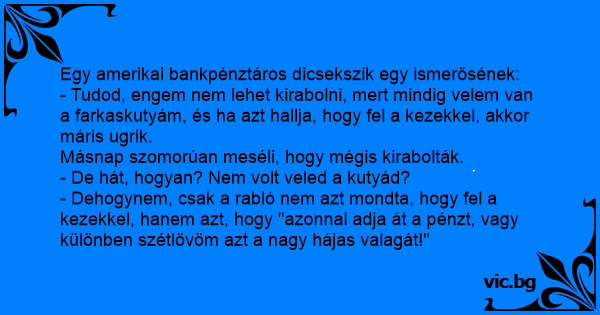 - Tudod, engem nem lehet kirabolni, mert mindig velem van a farkaskutyám, és ha azt hallja, hogy fel a kezekkel, akkor máris ugrik.
