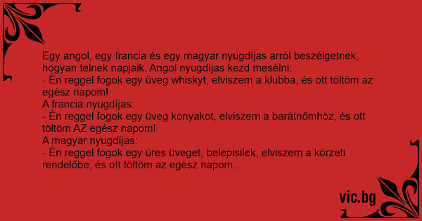 Egy angol, egy francia és egy magyar nyugdíjas arról beszélgetnek, hogyan telnek napjaik. Angol nyugdíjas kezd mesélni: