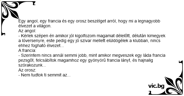Egy angol, egy francia és egy orosz beszélget arról, hogy mi a legnagyobb élvezet a világon.
