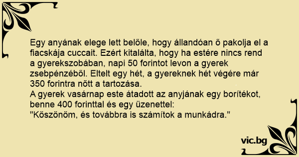 Egy anyának elege lett belőle, hogy állandóan ő pakolja el a fiacskája cuccait. Ezért kitalálta, hogy ha estére nincs rend a gyerekszobában, napi 50 forintot levon a gyerek zsebpénzéből. Eltelt egy hét, a gyereknek hét végére már 350 forintra nőtt a tartozása.