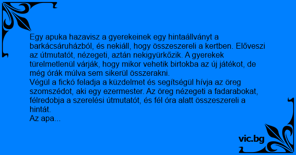Végül a fickó feladja a küzdelmet és segítségül hívja az öreg szomszédot, aki egy ezermester. Az öreg nézegeti a fadarabokat, félredobja a szerelési útmutatót, és fél óra alatt összeszereli a hintát.