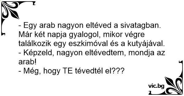 - Egy arab nagyon eltéved a sivatagban. Már két napja gyalogol, mikor végre találkozik egy eszkimóval és a kutyájával.