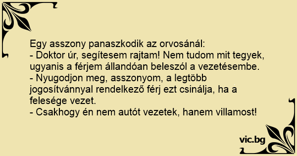 - Doktor úr, segítesem rajtam! Nem tudom mit tegyek, ugyanis a férjem állandóan beleszól a vezetésembe.