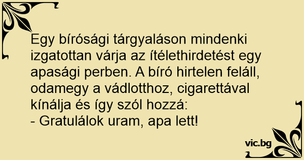 Egy bírósági tárgyaláson mindenki izgatottan várja az ítélethirdetést egy apasági perben. A bíró hirtelen feláll, odamegy a vádlotthoz, cigarettával kínálja és így szól hozzá: