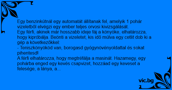 Egy férfi, akinek már hosszabb ideje fáj a könyöke, elhatározza, hogy kipróbálja. Beönti a vizeletet, kis idő múlva egy cetlit dob ki a gép a következőkkel: