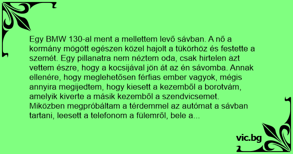 Egy BMW 130-al ment a mellettem levő sávban. A nő a kormány mögött egészen közel hajolt a tükörhöz és festette a szemét. Egy pillanatra nem néztem oda, csak hirtelen azt vettem észre, hogy a kocsijával jön át az én sávomba. Annak ellenére, hogy meglehetősen férfias ember vagyok, mégis annyira megijedtem, hogy kiesett a kezemből a borotvám, amelyik kiverte a másik kezemből a szendvicsemet.