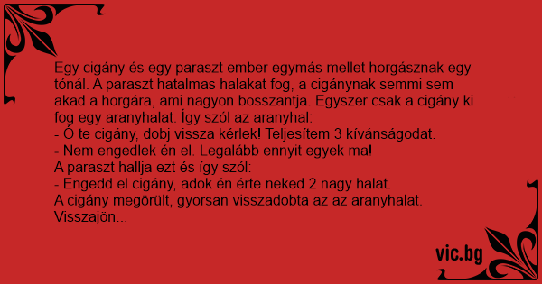 Egy cigány és egy paraszt ember egymás mellet horgásznak egy tónál. A paraszt hatalmas halakat fog, a cigánynak semmi sem akad a horgára, ami nagyon bosszantja. Egyszer csak a cigány ki fog egy aranyhalat. Így szól az aranyhal: