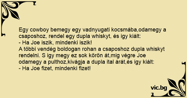 A többi vendég boldogan rohan a csaposhoz dupla whiskyt rendelni. S igy megy ez sok körön át,mig végre Joe odamegy a pulthoz,kivágja a dupla ital árát,és igy kiált: