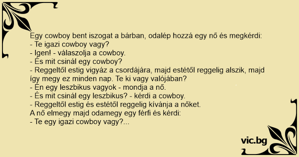 Bemegy egy cowboykalapos, bőrnadrágos, magasszárú csizmás fickó a bárba és leül a pulthoz. Rendel egy italt, amikor a mellette ülő nő megkérdi tőle: - Mondja, maga igazi cowboy? Csak azért kérdem,...