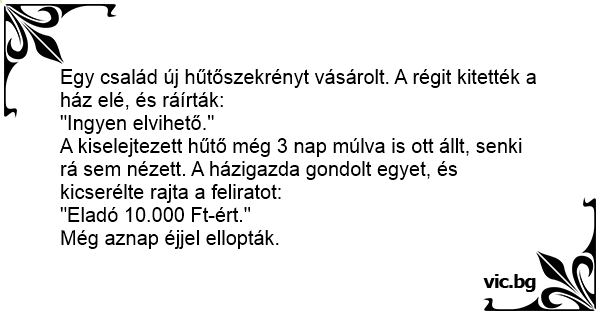 A kiselejtezett hűtő még 3 nap múlva is ott állt, senki rá sem nézett. A házigazda gondolt egyet, és kicserélte rajta a feliratot: