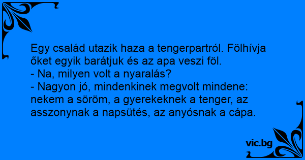 - Nagyon jó, mindenkinek megvolt mindene: nekem a söröm, a gyerekeknek a tenger, az asszonynak a napsütés, az anyósnak a cápa.