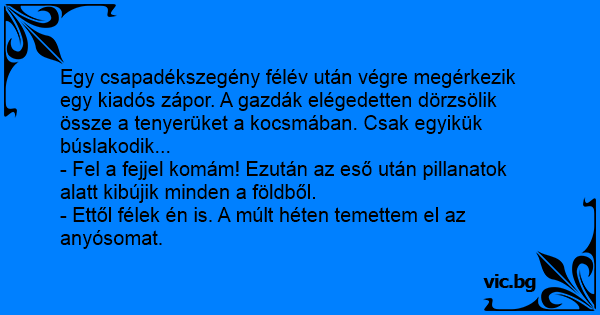 Egy csapadékszegény félév után végre megérkezik egy kiadós zápor. A gazdák elégedetten dörzsölik össze a tenyerüket a kocsmában. Csak egyikük búslakodik...