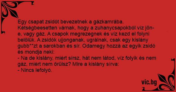 Egy csapat zsidót bevezetnek a gázkamrába. Kétségbeesetten várnak, hogy a zuhanycsapokból víz jön-e, vagy gáz. A csapok megrezegnek és víz kezd el folyni belőlük. A zsidók ujjonganak, ugrálnak, csak egy kislány gubb**zt a sarokban és sír. Odamegy hozzá az egyik zsidó és mondja neki:
