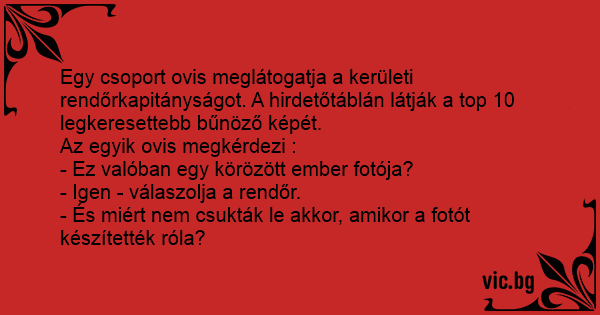 Egy csoport ovis meglátogatja a kerületi rendőrkapitányságot. A hirdetőtáblán látják a top 10 legkeresettebb bűnöző képét.