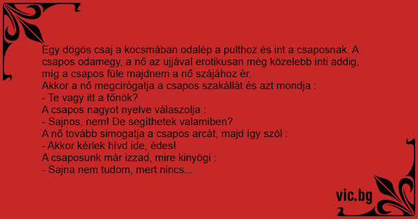 Egy dögös csaj a kocsmában odalép a pulthoz és int a csaposnak. A csapos odamegy, a nő az ujjával erotikusan még közelebb inti addig, míg a csapos füle majdnem a nő szájához ér.