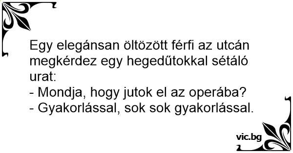 Egy elegánsan öltözött férfi az utcán megkérdez egy hegedűtokkal sétáló urat:
