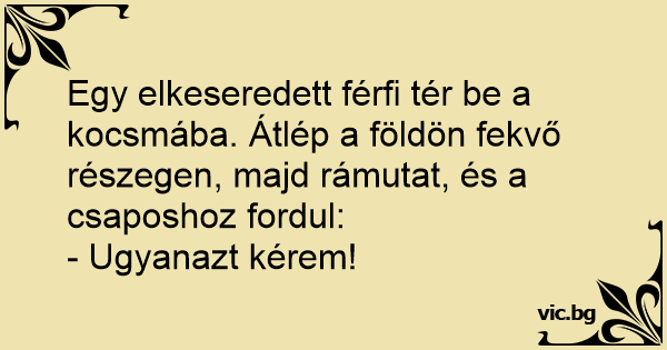 Egy elkeseredett férfi tér be a kocsmába. Átlép a földön fekvő részegen, majd rámutat, és a csaposhoz fordul: