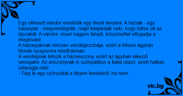 - Már megbocsásson! Azt még elnézem, hogy a saját ágyamban döngeti a feleségem, de legalább ne a seggemet használja eredményjelző táblának!