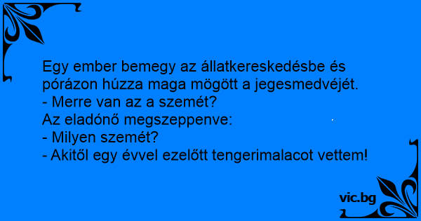 Egy ember bemegy az állatkereskedésbe és pórázon húzza maga mögött a jegesmedvéjét.