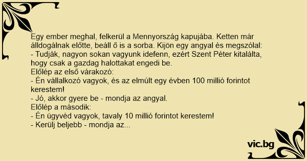 Egy ember meghal, felkerül a Mennyország kapujába. Ketten már álldogálnak előtte, beáll ő is a sorba. Kijön egy angyal és megszólal: