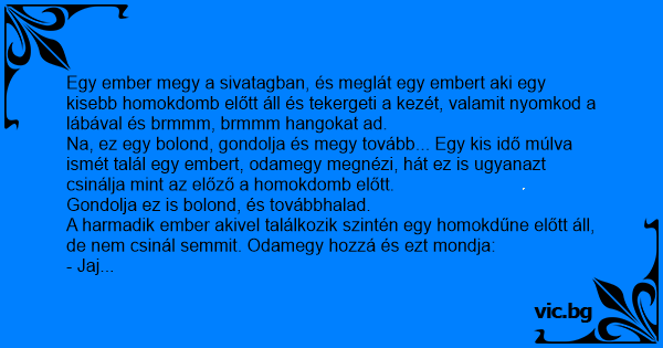 Na, ez egy bolond, gondolja és megy tovább... Egy kis idő múlva ismét talál egy embert, odamegy megnézi, hát ez is ugyanazt csinálja mint az előző a homokdomb előtt.
