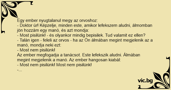 - Doktor úr! Képzelje, minden este, amikor lefekszem aludni, álmomban jön hozzám egy manó, és azt mondja:
