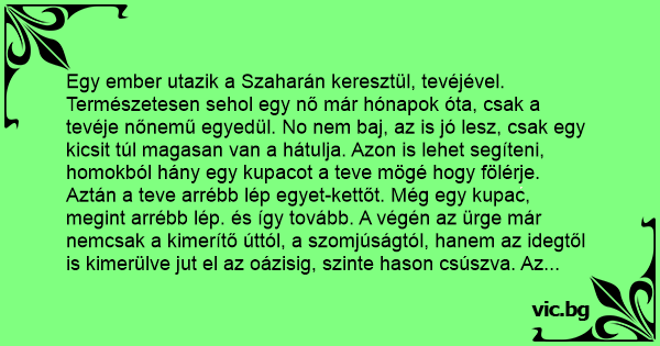 Egy ember utazik a Szaharán keresztül, tevéjével. Természetesen sehol egy nő már hónapok óta, csak a tevéje nőnemű egyedül. No nem baj, az is jó lesz, csak egy kicsit túl magasan van a hátulja. Azon is lehet segíteni, homokból hány egy kupacot a teve mögé hogy fölérje. Aztán a teve arrébb lép egyet-kettőt. Még egy kupac, megint arrébb lép. és így tovább. A végén az ürge már nemcsak a kimerítő úttól, a szomjúságtól, hanem az idegtől is kimerülve jut el az oázisig, szinte hason csúszva. Az oázisnál szép arab leányok korsóból hűvös vízzel kínálják és felajánljak, hogy teljesítik minden kívánságát. Mire az illető:
