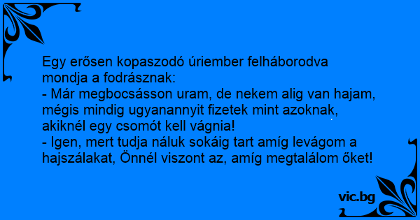- Már megbocsásson uram, de nekem alig van hajam, mégis mindig ugyanannyit fizetek mint azoknak, akiknél egy csomót kell vágnia!