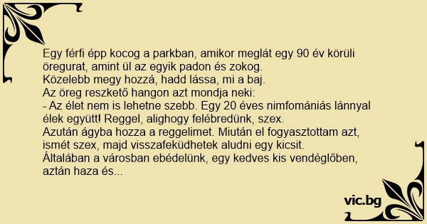 - De hát ez a tökéletes életforma, amire mindig is vágytam! Akkor meg mi a fenének üldögél és pityereg itt, a parkban?